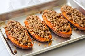 - Carefully flip the sweet potatoes over and season with cinnamon and nutmeg. Using a fork, gently mash the flesh. Then, sprinkle the crumble topping evenly over the sweet potatoes.